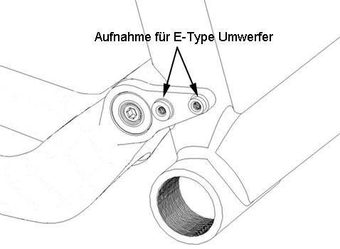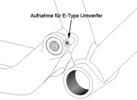 ↑ Es befindet sich nur ein Aufnahmegewinde für den E-Type Umwerfer im Hauptrahmen.