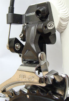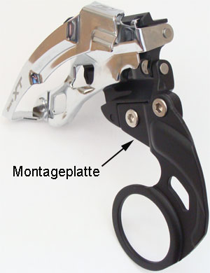 Der Umwerfer ist zusätzlich mit einer Montageplatte am Innenlager geklemmt. →